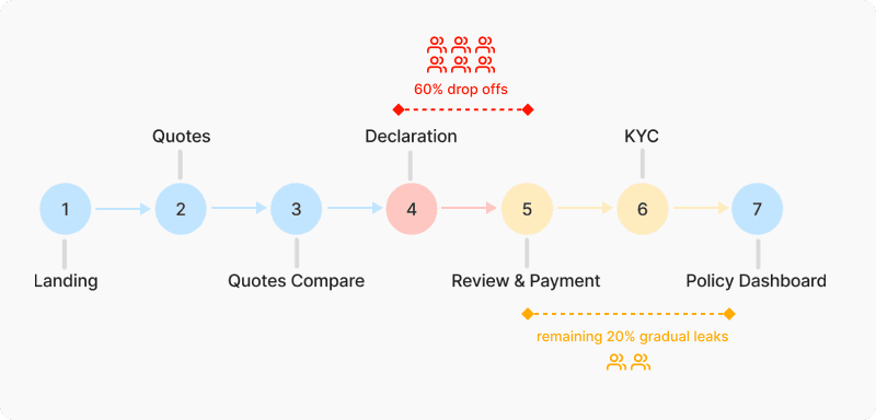 60% of users dropped off during health declaration. These users had already selected plans and add-ons which showed their intent to purchase was strong. Something in this and subsequent steps was blocking them.